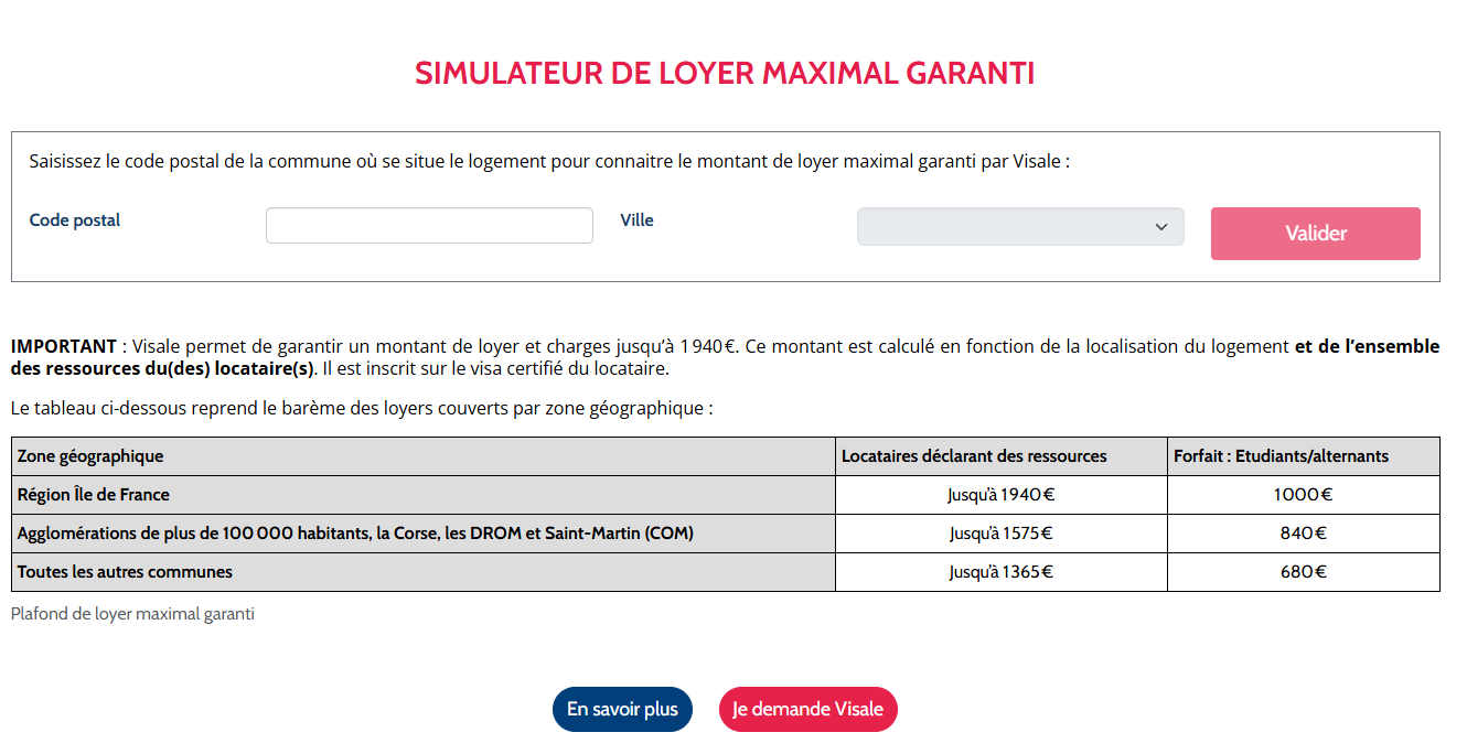 Saisissez le code postal de la commune où se situe le logement pour connaitre le montant de loyer maximal garanti par Visale